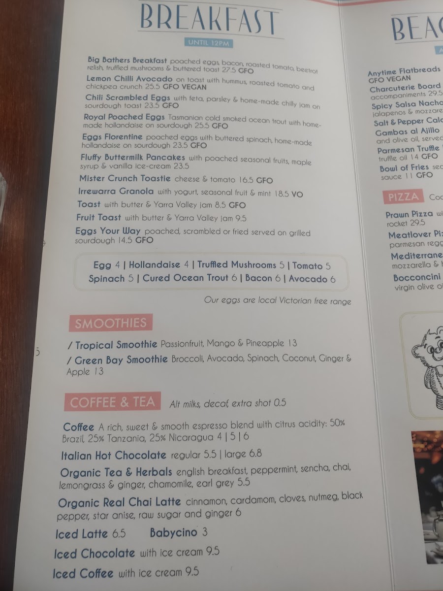 The menu features a range of mouthwatering options, such as the Big Bathers Breakfast, which combines flavors like beetroot relish and fresh mushrooms, served alongside perfectly poached eggs. Seafood lovers rave about the King Reef Barramundi, described as magical and the best they've ever had.